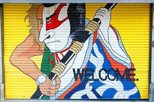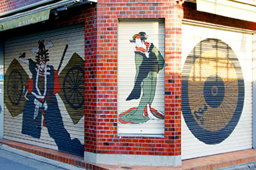 In order to prevent graffiti on the shutters of shops, art students and designers have worked together to make the “All town art gallery,” with eyecatching artworks on the shutters that stop people in their tracks.
